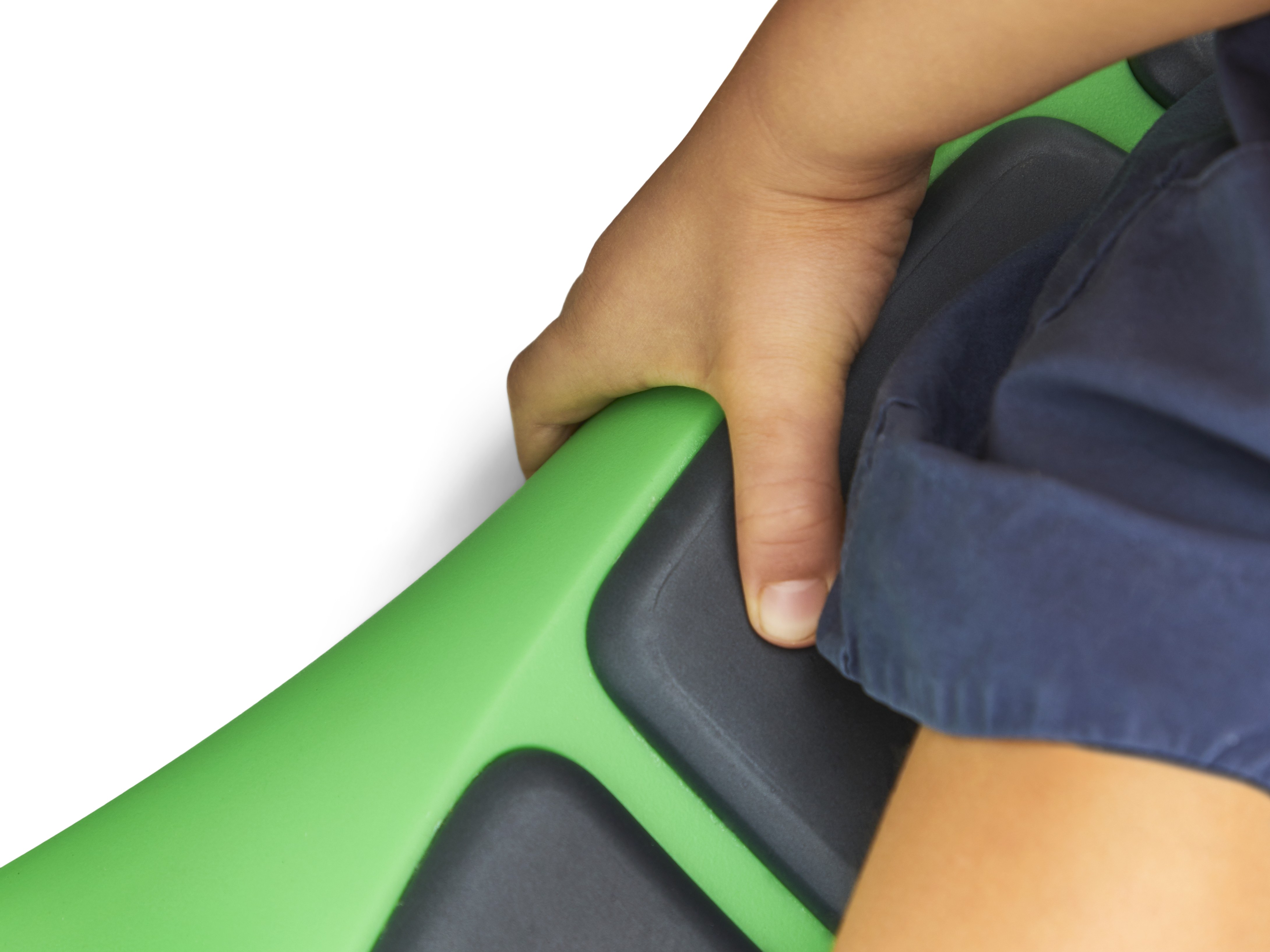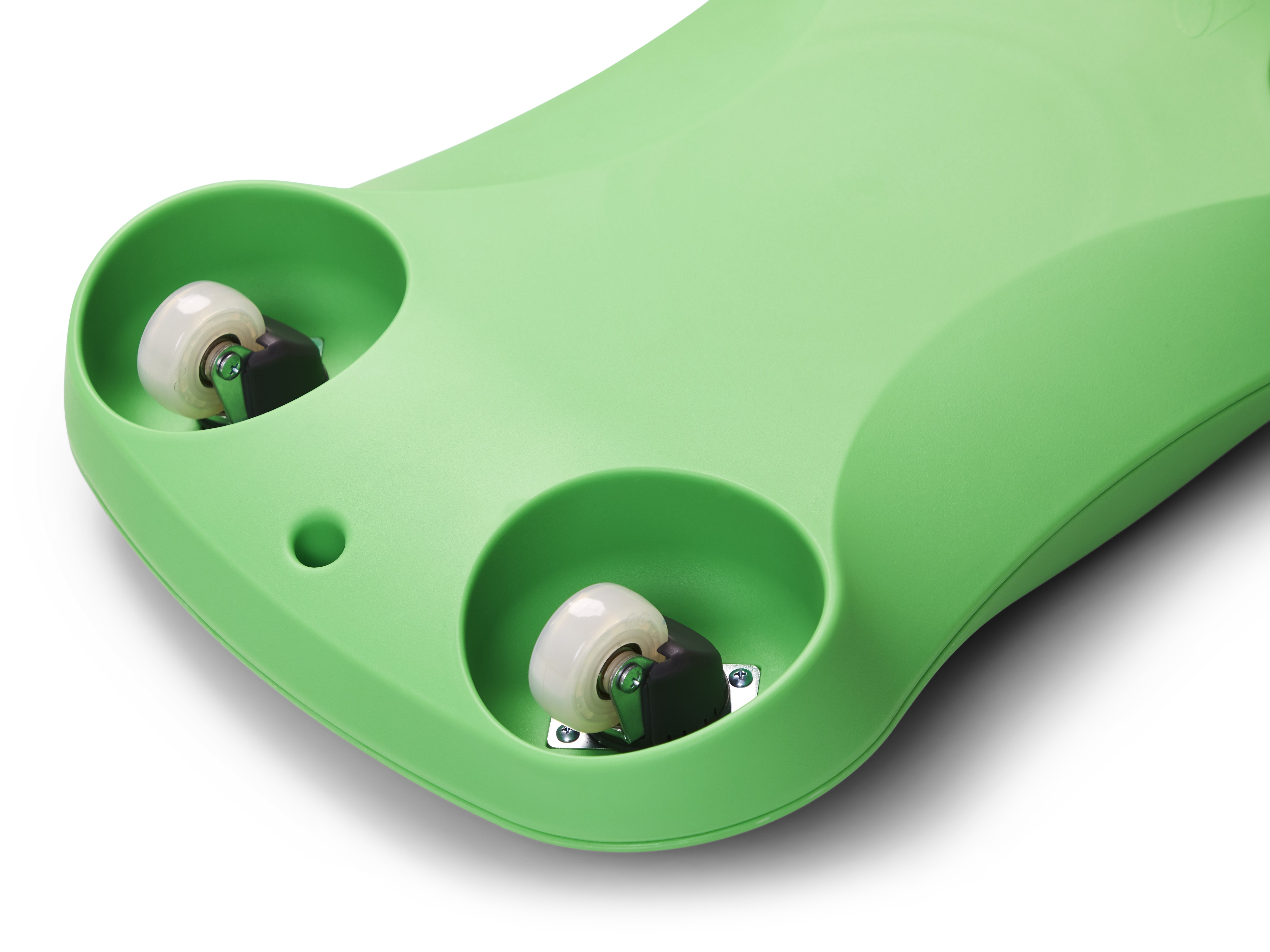 Floor Surfer combines smooth rolling play with focused motor training. Developed with children’s physiotherapists, it supports safe gliding in prone, sitting, or kneeling so every child can join at a suitable level. The narrow sides act as handholds, and the protruding corners shield fingers as children grip and steer. The front is slightly tapered to free arm movement, and the raised nose supports the coccyx in sitting and the sternum in lying, promoting good alignment and comfort. Clear PU wheels with non‑smudge, double ball bearings run quietly and are screened to minimise the risk of rolling over fingers, providing predictable motion on indoor floors.